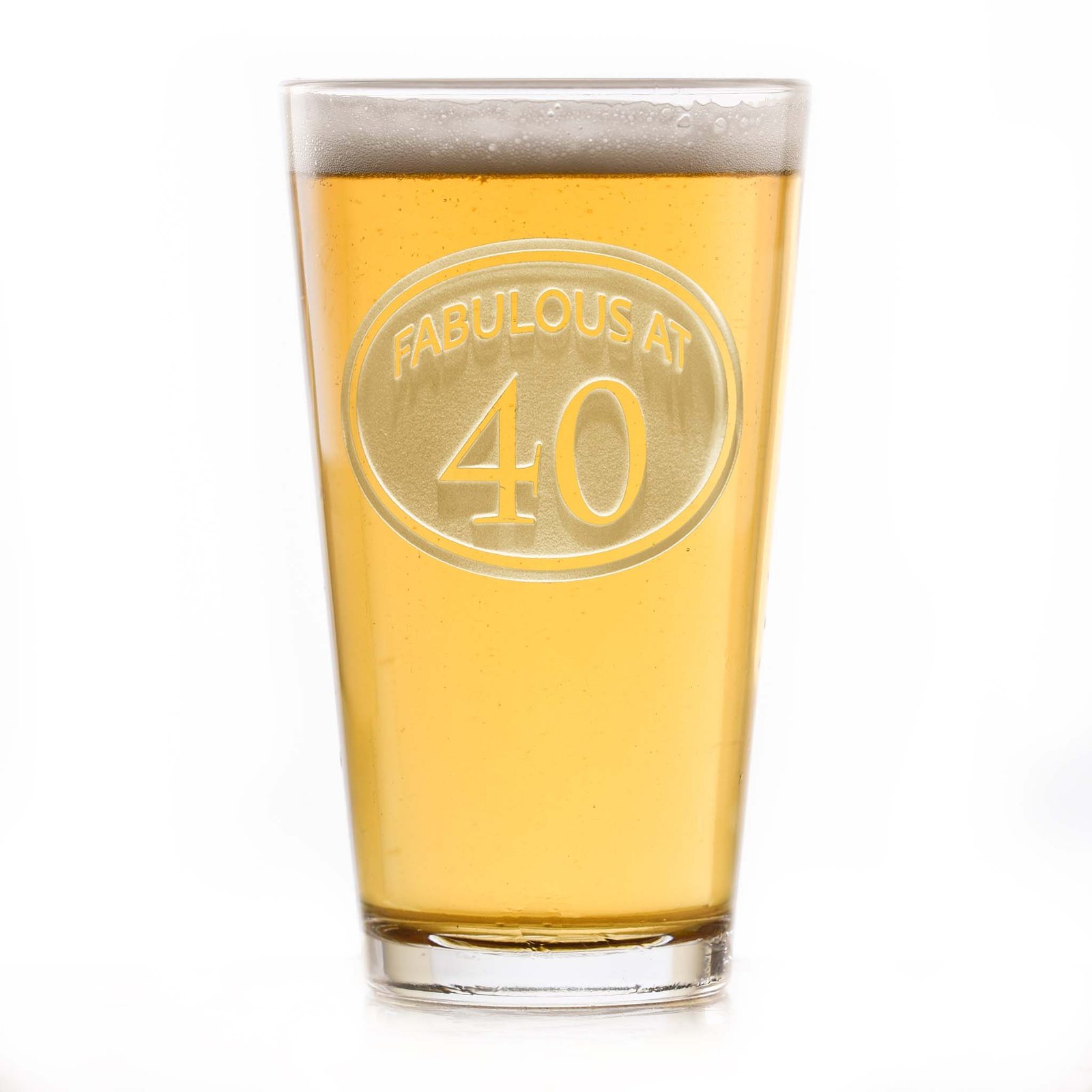 Engraved custom Fabulous at 40th Birthday beer glass for him or her. A fun birthday gift on a handsome pint glass is the best birthday gift for men or women celebrating a fortieth birthday. Our master carvers will deeply carve out the background of the design, leaving your monogram and artwork raised from the glass in a stunning 3D manner. Our deeply carved 40th birthday pint glasses are a jaw dropping personalized gift that is unmatched by simple engraving. Measures 6′ high by 3.5′ wide. At 16 oz, our pub glass will hold plenty of your favorite beverage. Dishwasher safe. 40th birthday glass for him or her is made in the USA.
