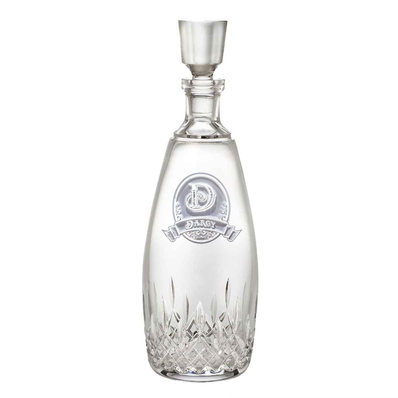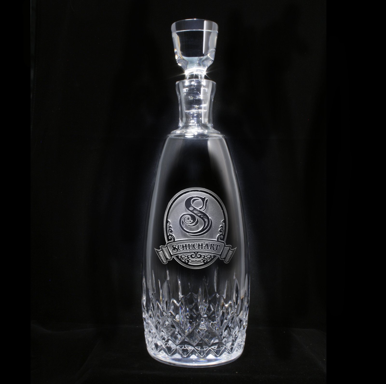 Engraved Waterford Crystal Decanter is the popular best selling Lismore Essence Decanter with Stopper and Free Personalization! Great for decanting your favorite whiskey, scotch, bourbon, rye, moonshine, brandy, or even wine, this exquisitely etched crystal decanter makes the perfect gift for men and women, especially for the man who has everything or the woman who has everything. Also a cool wedding gift idea, housewarming, hostess gift, retirement, anniversary, birthday or any special occasion gift for that special someone. Deeply carved using our sand carving technique, each glass decanter with glass stopper is carefully custom made to order by our master glass artisans making it a memorable addition to any home bar, bar cart, or man cave. Our engraving technique doesn t merely etch the surface like other glass engravers. Our process involves a five-step process resulting in a jaw-dropping 3D effect on your custom glassware and barware. Waterford Lismore Essence is the next generation of the classic Lismore pattern, retaining the brilliance and clarity of Lismore, while incorporating a more slender, modern profile. Add a new dimension to fine wines, brandy, and eau de vie by decanting them into the cool, contemporary Lismore Essence Decanter with Stopper. Combining traditional decanter styling with a slimmer profile, the decanter highlights Lismore’s dramatic diamond and wedge cuts while retaining the comforting weight and stability you expect from Waterford’s hand-crafted, fine crystal. Waterford crystal barware item code 151746, Free Personalization, Free Engraving! Hand wash. Read detailed Waterford Crystal care instructions on our Customer Service page found at the bottom of each page on our site. Glass decanter with glass stopper holds 36 oz. and measures 12 3/4 high. WARNING: Consuming foods or beverages that have been kept or served in leaded crystal products or handling products of leaded crystal will expose you to lead, a chemical known to the State of California to cause birth defects or other reproductive harm.